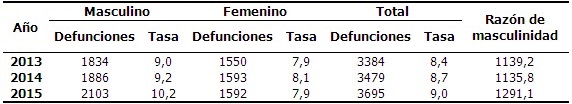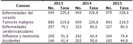 Las cinco primeras causas de muerte mantuvieron el mismo orden, y fue la primera las enfermedades del corazón, con tasas similares en los años 2013 y 2014, pero con un incremento del 5 % en año 2015. Luego, los tumores malignos, las enfermedades cerebrovasculares, la influenza y neumonías, (única enfermedad transmisible dentro las causas estudiadas), con una tasa de 74,4 por cada 100 000 habitantes en el año 2015, lo que representó un incremento de un 43 %. Los accidentes se mantuvieron en la quinta posición, con tasas de 41,4 por cada 100 000 habitantes en el año 2013 y con 50,6 y 44,8 por cada 100 000 habitantes en los años 2014 y 2015 respectivamente, para un decrecimiento de las tasas en un 11 %. (Tabla 6).