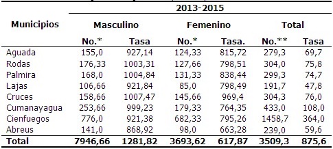 El municipio con mayor tasa de mortalidad fue Cienfuegos, con 364,0, seguido por Cumanayagua, con 108,0, y Cruces, con 76,0. Predominó la mortalidad en el sexo masculino en todos los municipios, con una tasa para este grupo en la provincia de 1281,82. (Tabla 3).