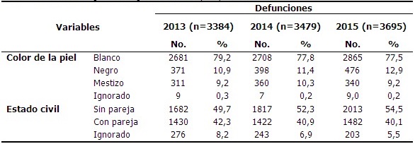 Se observó predominio de los fallecidos con color blanco de la piel, sobre todo en el año 2013, cuando llegaron a representar el 79,2 %, seguido de los de color de piel negro y mestizos, con más altos porcentajes en 2015 y 2014, con 12,9 y 10,3 %, respectivamente. Según el estado civil, prevalecieron los fallecidos sin pareja, con 54,5 % como el porcentaje más elevado, correspondiente a 2015. (Tabla 4).