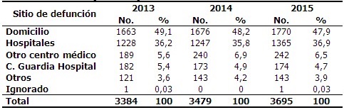 Casi todas las muertes ocurrieron en el domicilio, seguidas de las acontecidas en el hospital, y ello se comportó de igual forma para los tres años estudiados. (Tabla 5).