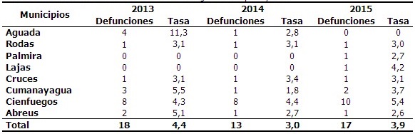 En cuanto a los menores de un año, en el año 2013 la tasa de mortalidad en la provincia fue de 4,4 por 1000 nacidos vivos (mayor tasa del trienio); en ese mismo año, el municipio de Aguada presentó la tasa más alta de la provincia con 11,3 por 1000 nacidos vivos. El año 2014 exhibió la tasa de mortalidad más baja de los años estudiados con tasa de mortalidad de 3,0 por cada 1000 nacidos vivos, superando la tasa provincial el municipio Cienfuegos con 4,4 por cada 1000 nacidos vivos; lo mismo ocurrió en el 2015, cuando la tasa del municipio cabecera fue de 5,4 por cada 1000 nacidos vivos. (Tabla 7).