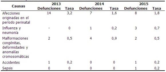 Dentro del grupo de las principales causas de muerte en el recién nacido se observaron las provocadas por ciertas afecciones originadas en el período perinatal, que en el año 2013 presentaron la tasa más elevada del trienio, con 3,2 por cada 1000 nacidos vivos; en el año 2014, hubo 7 fallecidos menos por esta causa, con una tasa de 1,6 por cada 1000 nacidos vivos; la diferencia respecto al año 2015 fue mínima (1,8 por cada 1000 nacidos vivos), sin embargo se mantuvo como primera causa de muerte. (Tabla 8).