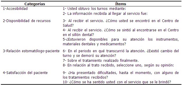 Conclusión: el cuestionario Satisfacción de los usuarios en servicios de Estomatología es un instrumento adecuado y con criterios apropiados para el uso en el terreno investigativo, así como en la práctica de dichos servicios, ya que permite obtener datos sobre la satisfacción de los usuarios.