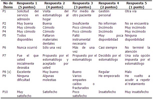Posteriormente, se confeccionó la escala de calificación que quedó establecida de la siguiente forma: Total de puntuación 50 puntos, de 50 a 38 puntos (satisfecho) menos de 38 puntos (insatisfecho).