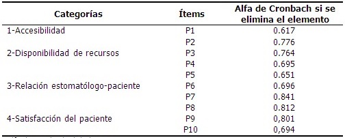 El instrumento elaborado permite ofrecer a directivos de Estomatología y responsables del comité auditor de la calidad de los servicios de Estomatología (CACSE), una herramienta metodológica capaz de evaluar el comportamiento del paciente más allá del manejo empírico que se obtiene por una encuesta abierta, o la simple opinión del paciente, la cual muchas veces está sesgada por la subjetividad natural del desconocimiento del paciente ante las características del tratamiento estomatológico. Presenta consistencia interna, y por tanto, una adecuada propiedad de homogeneidad. Es confiable para medir el nivel de satisfacción de los usuarios del servicio de Estomatología General Integral. Tiene validez de construcción, y esto constituye un importante indicador de su valor y una justificación estimable tenida en cuenta en el proceso de validación, pues esta alternativa de validez permite hacer una valoración crítica del constructo teórico del que se parte, y de las categorías que se proponen, las cuales expresan un modo singular de conceptualizar el objeto de estudio, tal y como se ha expresado en este y en trabajos precedentes.(11,12,13,14,15)