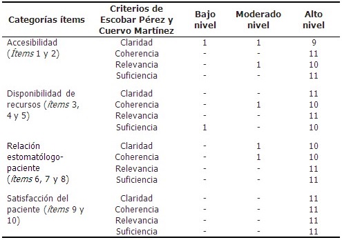 Se solicitó a los expertos que emitieran sus valoraciones en cuanto a si existía una diferenciación clara de las categorías a través de los ítems, y si en estos se cumplían los principios básicos (expuestos por Moriyama) (7) para la construcción de instrumentos: