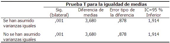 La prueba de comparación de medias en muestras independientes, dio como nivel de significación p= 0,01, o sea, diferencia significativa entre las dos muestras. (Tabla 6).