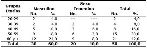 Predominó el género masculino (60,0 %) y el grupo etario de 60 años y más (42,0 %), seguido en orden descendente por el de 50-59 (30,0 %). (Tabla 1).