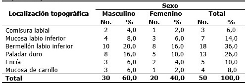 El bermellón del labio inferior fue el sitio anatómico de mayor proporción en que se manifestó la infección por el virus con 36,0 % y el género masculino el más infectado (20,0 %). (Tabla 2).