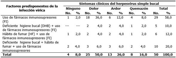 Métodos: se realizó un estudio descriptivo y transversal, con un universo de 50 pacientes con trasplante renal y diagnóstico clínico de infección herpética, asistidos en la consulta estomatológica del Policlínico de Especialidades del Hospital Provincial Clinicoquirúrgico Universitario Saturnino Lora Torres, de Santiago de Cuba, desde noviembre de 2014 hasta igual mes de 2016. Para la recolección del dato primario se confeccionó una encuesta que incluía las siguientes variables: edad, sexo, localización topográfica, síntomas clínicos y factores predisponentes de la lesión, así como alteraciones celulares presentes en el epitelio de la boca. Se realizó estudio citopatológico de las lesiones.