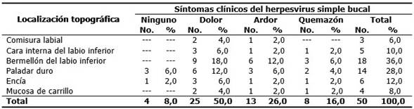 Los hallazgos relacionados con el sitio más susceptible de infección del herpesvirus bucal son similares a los obtenidos en otras series,(4,5,6) donde se plantea que las lesiones herpéticas pueden ubicarse en cualquier zona anatómica queratinizada de la mucosa labial y bucal, preferentemente en los labios, paladar duro y encías, la lengua y carrillos hasta la parte posterior de la garganta.
