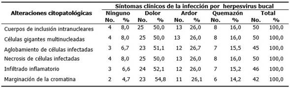 Resultados: en la serie predominó el sexo masculino y el dolor como síntoma clínico, el sitio de mayor ocurrencia fue el bermellón del labio inferior; la presencia de células epiteliales gigantes multinucleadas con cuerpos de inclusiones intranucleares y necrosis de células infectadas, respectivamente, fueron los hallazgos citológicos más importantes.