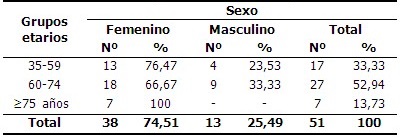 Fueron examinados 51 pacientes, de ellos 25,49 % del sexo masculino y 74,51 % femeninos. El mayor porcentaje se agrupó en las edades de 60-74 años con un 52,94%. (Tabla 1).