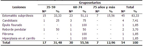La lesión más observada fue la estomatitis subprótesis con el 83,33 %, seguida por la candidiasis con el 7,41 %. Los mayores porcentajes aparecieron en los grupos de edades de 60 a 74 años con el 55,56 % y de 35 a 59 años con el 31,48 %. (Tabla 2).