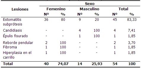 El mayor porcentaje de lesiones se registró en el sexo femenino con el 74,07 %, y el valor más alto correspondió a la estomatitis subprótesis, con el 80 % para este sexo. (Tabla 3).