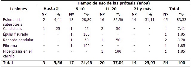 La distribución de lesiones según el tiempo de uso de la prótesis mostró que son más frecuentes cuando se utilizan por más de 10 años, específicamente de 11 a 20 años. Esto coincide con Gutiérrez Segura(5) que evidenció que el 49,2% eran portadores de prótesis por más de 10 años. Esto reafirma el hecho de que la prótesis es un elemento que actúa como un cuerpo extraño que va traumatizando las mucosas que la soportan, y más aún en la medida que pasa el tiempo provocando el daño a los tejidos y la consecuente aparición de lesiones.