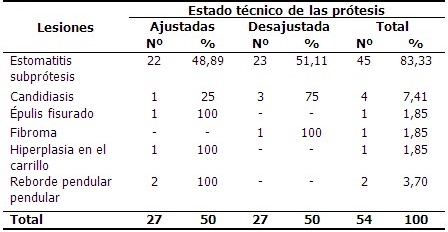 Resultados: predominaron los pacientes del sexo femenino (74,51 %) y entre 60 y 74 años (52,94 % del total y 66,67 % femeninos); la lesión más observada fue la estomatitis subprótesis con un 83,33 % fundamentalmente en pacientes que usaban prótesis entre 11 y 20 años (35,56 %); la mayor cantidad de lesiones se registraron en el sexo femenino con un 74,07 %; tanto las prótesis ajustadas (deterioradas) como las desajustadas causaron la misma cantidad de lesiones (50 %).