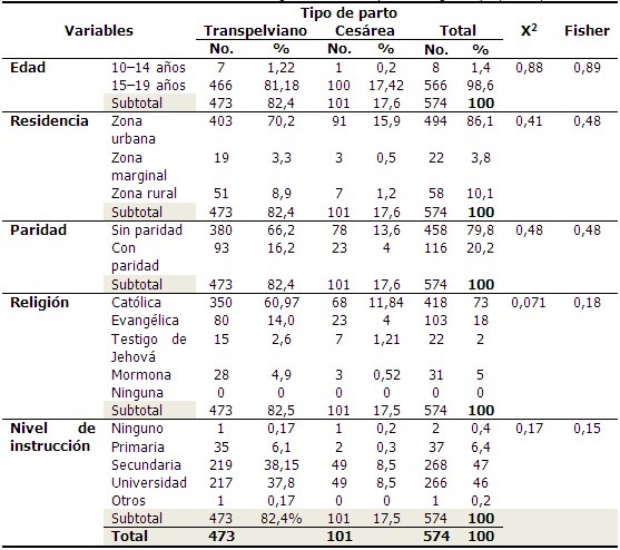 Methods: cross- descriptive, study. A number of 574 adolescents were studied from the city of Machala, Ecuador, in 2016, applying a personal survey. The relationship between the decision of the type of delivery with the variables age, residence, parity, religion and instruction was established in this group of adolescents; and the statistical association derived from these relationships was defined.