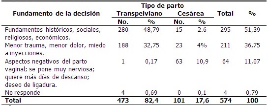 Results: the greater preference was towards trans-pelvic childbirth, with 82.4%. 70.2% of the adolescents belonged to urban areas, and 66.2% of them did not have previous births. The majority of them decided to have a trans-pelvic childbirth, despite the reasoning given regarding different sociocultural factors. There was a significant statistical relationship between the reasoning and the decision.