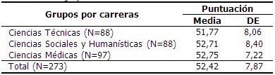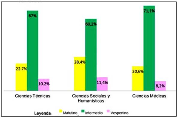 Methods: a cross-sectional analytical study was conducted in a series of 273 university students, selected by simple random sampling, structured in three groups based on provenance criteria: 88 from Technical Sciences, 88 from Social and Humanistic Sciences and 97 from Medical Sciences. The chronotype of each subject was explored through the Morningness and Eveningness Questionnaire. For each group the mean scores of the questionnaire and the proportions of morning, intermediate and evening individuals were calculated.