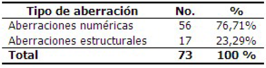 Las aberraciones cromosómicas son variaciones, espontáneas o inducidas, en el ADN y pueden afectar tanto su estructura como su cantidad. Están implicadas en la aparición de muchas enfermedades hereditarias, y son una causa importante de retraso mental y de pérdidas gestacionales. Se observan entre el 0,3 % y el 1 % de los nacidos vivos, en el 50 % de los abortos espontáneos del primer trimestre y en el 20 % de los del segundo trimestre.1