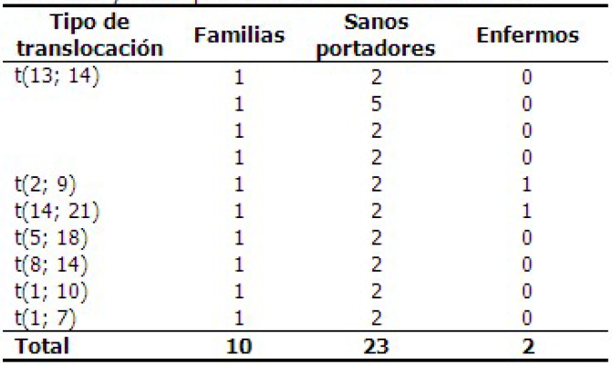 En las 10 familias estudiadas, se encontraron 23 individuos sanos portadores y 2 enfermos. La translocación observada con mayor frecuencia fue t(13;14). (Tabla 2)