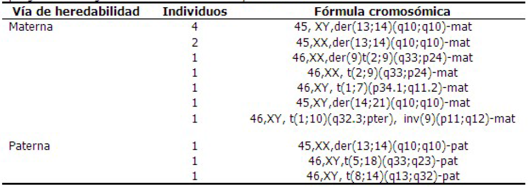 De los 25 casos diagnosticados en los estudios familiares, solo de 14 (13 diagnósticos prenatales y un estudio postnatal) se conoció la vía de heredabilidad de la translocación, 11 la heredaron por vía materna y 3 por vía paterna (Tabla 3).