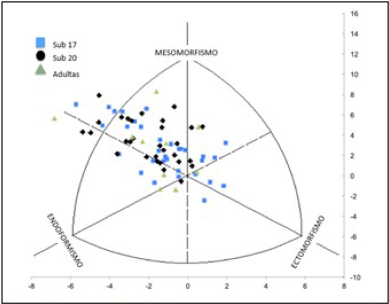 El 66,7 % de las jugadoras presentó un mesomorfismo como componente principal, representadas de manera heterogénea en esa zona de la somatocarta, de las cuales las jugadoras de la categoría Sub-20 fueron más numerosas, en quienes predominó dicho componente respecto a las jugadoras de la Sub-17 y Adultas. (Figura 1).
