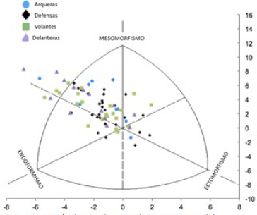 El somatotipo también es un elemento que puede aportar información relevante respecto a las dimensiones corporales de los jugadores de élite,6 dado que las características físicas son consideradas un requisito importante en el desempeño atlético.7 Existen evidencias de que el somatotipo varía según la actividad física realizada. Un estudio en mujeres que practicaban pilates clásico, observó un somatotipo meso-endomórfico predominante8, mientras que en otro realizado con mujeres que practicaban tenis de mesa de alto nivel, lo fue el endomórfico, mientras que el mesomorfismo manifestó un descenso.9 Se cree que las característica morfológicas del jugador podrían influir en las tácticas de juego del equipo10, por ello, la determinación de la morfología corporal, junto a una evaluación de ingesta alimenticia, permite ubicar correctamente al jugador dentro del equipo, lo que equivale a mejorar el rendimiento individual y colectivo.11-12