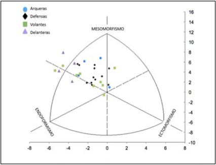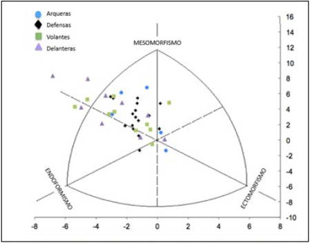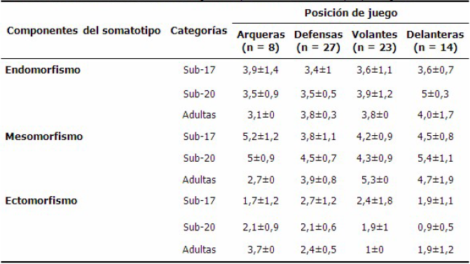 Al realizar el análisis por cada categoría y posición de juego, sigue predominando el componente mesomórfico, pero en la categoría Sub-17 este prevaleció en las volantes frente al de las otras posiciones de juego; en la categoría Sub-20 prevaleció en las defensas; y en la Adulta, lo hizo en las posiciones delanteras, resultados que se acercan a lo observado por Barraza y colaboradores.15