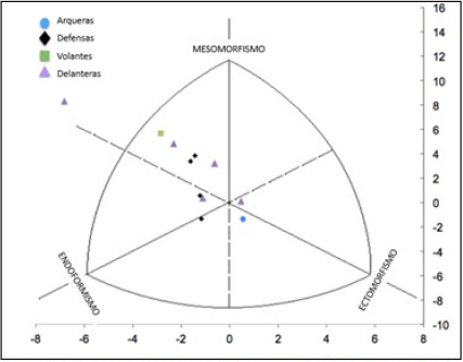 El somatotipo correspondiente a las tres categorías fue clasificado como meso-endomórfico, o sea, predominó el componente mesomórfico, seguido del endomórfico. Al analizarlo en relación con la posición de juego y categoría, no se encontraron diferencias significativas. (Tabla 3).