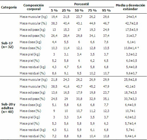 La clasificación de las medidas antropométricas según percentil por categorías y sus respectivas medias, expresaron diferencias significativas entre las categorías respecto a los valores absolutos y relativos de masa muscular y adiposa, respectivamente. Solo la masa ósea relativa fue significativamente mayor en la categoría Sub-17 respecto a las dos restantes categorías (p<0,05). (Tabla 2).
