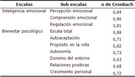 Los valores de las sub escalas de inteligencia emocional estuvieron dentro de los valores considerados adecuados como tal. Para el bienestar psicológico los valores oscilaron desde 0,63 a 0,88. (Tabla 1).