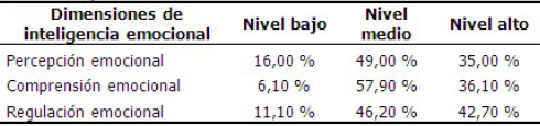 De la evaluación del nivel de inteligencia emocional, la regulación emocional se manifestó en el 42,7 % de los casos en el nivel alto y la percepción emocional fue la sub escala de menor porcentaje (16 %). (Tabla 2).