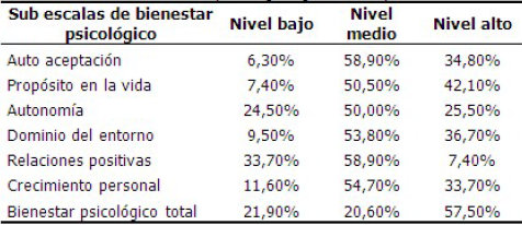 En general, un 57,5 % de los participantes del estudio presentó alto nivel de bienestar psicológico. Las dimensiones que más aportaron en este sentido, fueron: propósito en la vida (42,1 %), dominio del entorno (36,7 %), auto aceptación (34,8 %) y crecimiento personal (33,7 %), mientras que relaciones positivas (33,7 %) y autonomía (24,5 %) tuvieron su mayor puntaje en el nivel bajo. (Tabla 3).