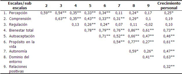 Las sub escalas aparecen numeradas en la primera columna y se incorporan solo de forma numérica en la primera fila: 2=Comprensión emocional, 3=Regulación emocional, 4=Bienestar total, 5=Autoaceptación, 6=Propósito en la vida, 7=Autonomía, 8=Dominio del entorno, 9=Relaciones positivas