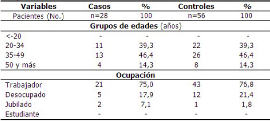 Predominó el grupo de edad de 35 a 49 años tanto en los casos como controles, representado por un 46, 4 %, seguido el grupo de 20-34 años (39,3 %). En relación con la ocupación, se encontró que tanto en los casos como en los controles predominaron los trabajadores con un 75,0 % y 76, 8 % respectivamente. (Tabla 1).