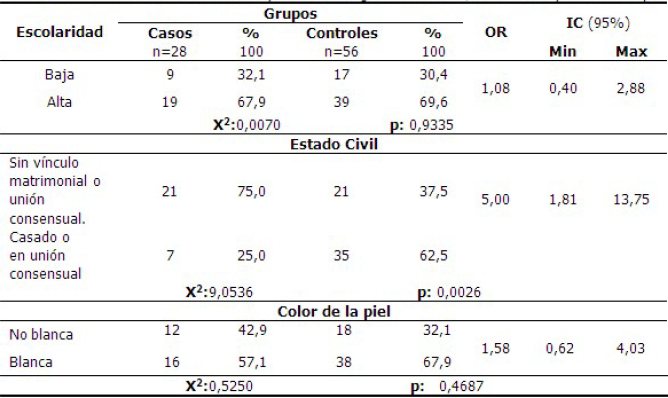 Predominó un nivel de escolaridad alto tanto en casos como en controles, con un 67,9 % y un 69,6 % respectivamente. El valor de p fue mayor de 0,05 y el intervalo de confianza del OR fue no significativo. En relación con el estado civil se apreció que 21 pacientes con VIH (75,0 %) de los 28 existentes, se encontraban sin vínculo matrimonial o unión consensual, mientras que solo el 37,5 % de los controles presentaban igual situación. El color de la piel blanco prevaleció en ambos grupos estudiados, los casos con un 57,1 % y los controles con 67,9 %. (Tabla 2).
