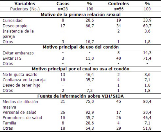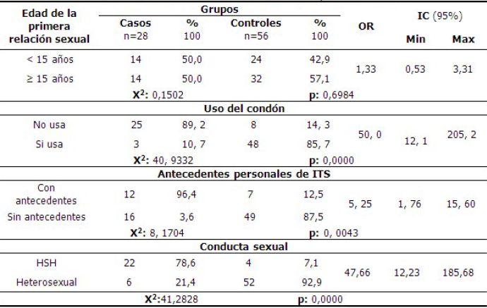 Al comparar la edad de la primera relación sexual, el uso del condón, los antecedentes de ITS y la conducta sexual en ambos grupos se observó que la mitad de los casos planteó tener su primera relación sexual antes de los 15 años, mientras que en los controles 24 individuos para un 42,9 % tuvieron su primera relación sexual antes de los 15 años de edad. Respecto al uso del condón el 89,2 % de los casos refirió no usarlo; el grupo de controles se comportó de manera diferente a los casos, el mayor porcentaje (85,7 %) refirió usarlo. Los antecedentes personales de ITS, fueron referidos en el 96, 4 % de los casos y solo por el 12, 5 % de los controles. En relación con la conducta sexual, en los casos, el 78,6 % expresó tener relaciones sexuales con otros hombres, mientras que solo el 7,1 % de los controles refirió coincidir con esta conducta sexual. (Tabla 3).