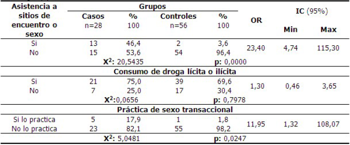 Resultados: los principales factores de riesgo identificados fueron no tener vínculo matrimonial o unión consensual, el no uso del condón, el antecedente de una infección de transmisión sexual, tener sexo con otros hombres, la práctica de sexo transaccional y la visita a sitios de encuentro.