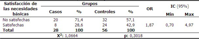 No existió asociación estadísticamente significativa entre la satisfacción de las necesidades básicas y la condición de padecer de VIH en estos individuos, por lo que no se consideró como un factor de riesgo en los casos estudiados.