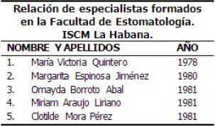 Con la formación de posgrado en el país se comienzan a formar los primeros especialistas de la atención secundaria que realizaron sus estudios en los institutos y en el caso de esta especialidad se graduó el primer especialista en la Facultad de Estomatología de La Habana en 1978, la Dra. María Victoria Quintero, posteriormente se gradúa un especialista en el 1980 y tres en el 1981.