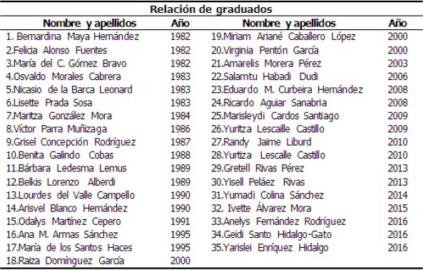 Hasta el 2017 la provincia ha formado 35 especialistas, tres de ellos extranjeros, uno procedente de Chile, otro de República Saharaui y el tercero de St Kitts-Nevis.