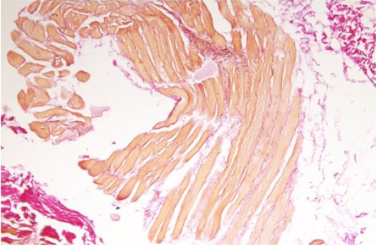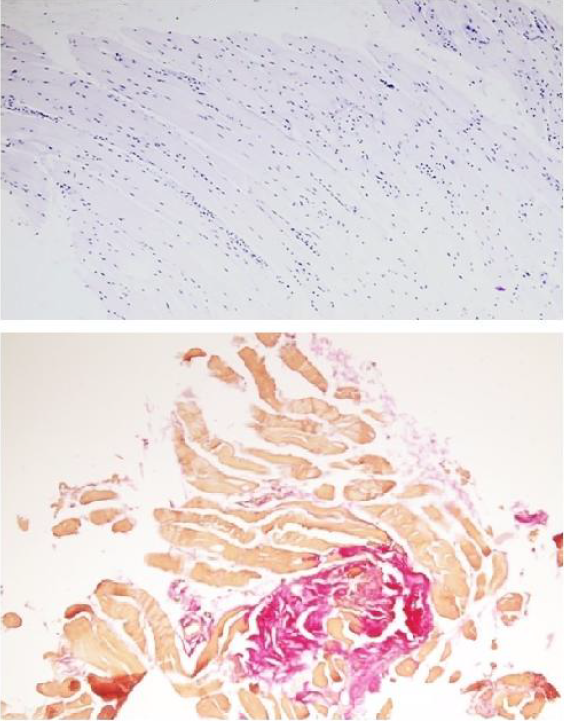 Biopsia de músculo: (B- 1795-2017) de la región deltoidea: El músculo mostró cambios en fibras aisladas consistente en núcleos sarcolémicos numerosos, con degeneración basófila del citoplasma de las fibras musculares, fagocitosis por histiocitos en numerosas fibras con cambios degenerativos aisladamente distribuidos. Al aplicar técnica tricrómica de Van Gieson se observó aumento focal del endomicio en relación con fibras musculares dañadas.