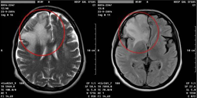 En septiembre del año 2014 comenzó a presentar cefalea fronto-ocular. En el Servicio de Urgencias se le realizó fondo de ojo (FO) y se constató papiledema bilateral. Por este hallazgo se indicó tomografía axial computarizada (TAC) de cráneo, en la que se demostró gran área hiperdensa con otras hipodensas a nivel del lóbulo frontal derecho, edema perilesional y borramiento de surcos y circunvoluciones. La paciente fue ingresada para estudio.