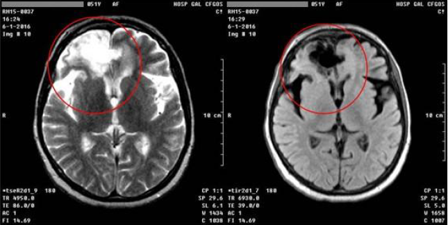 En la resonancia magnética nuclear (RMN) de cráneo se observó imagen en la región frontal derecha que recordaba edema en dedo de guante, hipointensa en T1 e hiperintensa en T2 y flair; que desplazaba 8 mm las estructuras de la línea media de derecha a izquierda y comprimía el asta frontal de este lado, todo lo anterior en relación con posible tumor cerebral. (Figura 1).