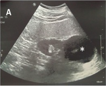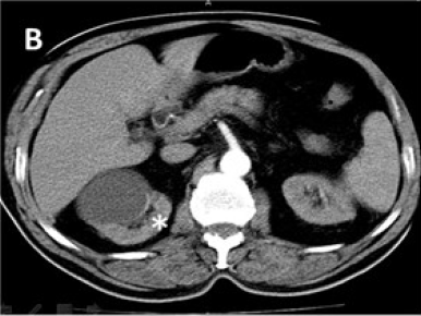 Ultrasonido (UTS) abdominal: hígado de tamaño normal con marcado aumento de su ecopatrón de aspecto graso. Vesícula biliar con imágenes de litiasis de 4 y 8 mm y de paredes finas. Vías biliares y páncreas normales. Riñón izquierdo (RI) de tamaño normal con quiste de 12 mm hacia el polo inferior que no produce hidronefrosis. Riñón derecho que impresiona de tamaño normal, observando hacia su polo superior una imagen predominantemente quística de 56 X 65 mm y que pudiera estar comprometiendo la glándula suprarrenal de ese lado. Litiasis en el grupo calicial medio. Vejiga normal. Se sugiere tomografía axial computarizada de abdomen (TAC). (Figura 1)