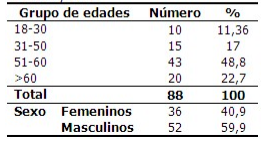 El 71,6 % de los pacientes tenían más de 50 años, ya que 43 pacientes tenían entre 51 y 60 años, y 20 pacientes eran mayores de 60 años de edad. Más del 50 % eran masculinos. (Tabla 1).