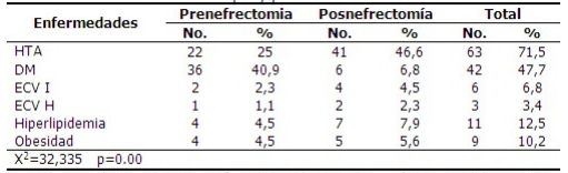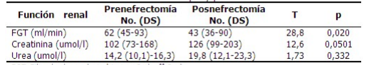 Tabla 4. Valores medios de función renal pre y posnefrectomía según enfermedades preexistentes