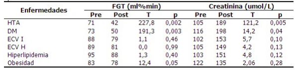 El análisis de los valores medios de función renal pre y posnefrectomía según las enfermedades preexistentes, indicó que las enfermedades que más influyeron en el deterioro de la función renal pos nefrectomía fueron la hipertensión arterial y la diabetes mellitus. En los pacientes con hipertensión arterial se registró una disminución del FGT con una media de 42 ml/min y en los diabéticos la media fue de 50 ml/min. (p<0,05). También se apreció una mayor elevación de los valores medios de creatinina sérica con valores de 189 umol/L y 198 umol/L respectivamente. (p<0,05).(Tabla 4).